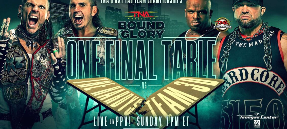 Les Hardy, désormais doubles champions par équipes de la TNA et de NXT, affrontent Team 3D dans un combat de tables historique. Ces deux duos légendaires se retrouvent pour ce qui pourrait être leur dernier affrontement en carrière. L’équipe victorieuse repartira avec les deux titres unifiés.