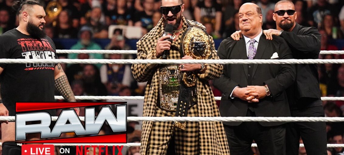 – La musique de Seth Rollins se lance et le clan The Vision arrive sur le ring. Rollins nous souhaite la bienvenue à Monday Night Rollins. Et si on ne le sait pas, il est notre champion Crown Jewel, champion World Heavyweight, un révolutionnaire, un visionnaire, et c’est The Vision. C’est sa vision et il faut prendre un moment pour la grandeur qui se retrouve sur le ring, quelque chose qu’il a assemblé. Premièrement, il y a Paul Heyman, un conseillé qui a été trahi par son meilleur ami. Il a pris Heyman sous son aile et avec sa vision Heyman a été solidifié comme le meilleur de tous les temps. Il est reconnaissant par sa présence. Rollins l’embrasse sur la tête. Rollins dit qu’il y a six mois il y avait des murmures au sujet du futur de Bron Breakker. Et sous sa vision Breakker est devenu encore plus qu’il ne pouvait l’imaginer et Breakker est devenu le futur incontesté de la WWE. Ensuite, on a Bronson Reed qui était sur la touche il y a six mois et qui ne pouvait pas battre Roman Reigns. Mais avec sa vision il lui a donné toutes ses connaissances sur Roman Reigns pour le battre et en plus détruire Roman Reigns et humilier Roman Reigns. Reed est le nouveau Chef de Tribu.