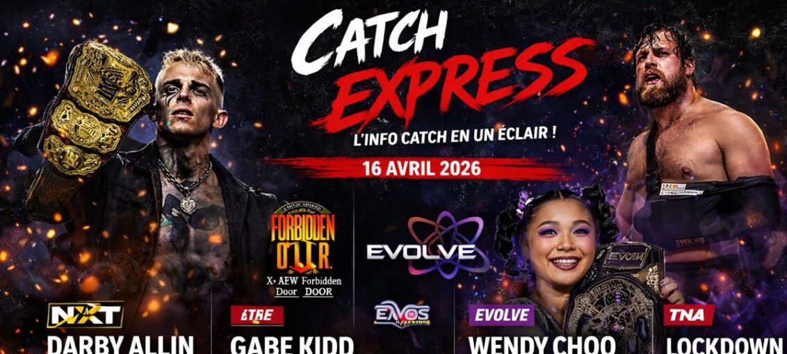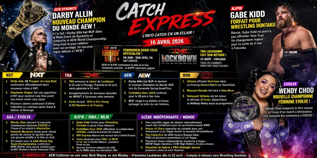 Catch Express du 16 Avril : NXT, AEW, TNA, ROH, NJPW, Indépendants ! AAA AEW AEW, Impact, NJPW, ROH EVOVLE ex WWE Indy NJPW Nouvelles NXT ROH TNA Impact by Rodrigue Tousignant - avril 16, 2026avril 16, 2026 Voici les nouvelles en vracs ailleurs qu’à la WWE dans les dernières 24h ! NXT Nouveaux noms confirmés à NXT : Shady Elnahas a officiellement pris le nom de Shido Ash, tandis qu’Eli Knight est devenu EK Prosper afin d’éviter toute confusion avec LA Knight. Lizzy Rain a également confirmé son nouveau nom après son arrivée au Performance Center. Stephanie Vaquer de passage à NXT : La Championne du Monde féminine a fait une apparition à NXT pour souhaiter bonne chance à Lola Vice avant son affrontement contre Jacy Jayne. Focus interne sur plusieurs talents en progression : Plusieurs noms continuent de gagner en importance en coulisses, notamment après les récents événements liés à Stand and Deliver et Revenge, avec une attention particulière sur les performances récentes et leur positionnement futur. TNA Retour officiel de Lockdown : La TNA a confirmé le retour de Lockdown le 23 août à Chicago. Tous les combats seront disputés à l’intérieur d’une cage d’acier. La prévente débute le 22 avril, suivie de la mise en vente générale le 24 avril. Séance d’enregistrements à Syracuse : La TNA enregistre une nouvelle série d’épisodes de iMPACT à l’Upstate Medical Arena, avec plusieurs développements attendus en vue des prochaines semaines. Carte confirmée pour iMPACT : EC3 vs Eric Young et KC Navarro vs AJ Francis sont annoncés pour l’épisode du jour, consolidant les rivalités en cours. AEW Darby Allin nouveau Champion du Monde de la AEW : Lors de Dynamite Spring BreakThru, Darby Allin a battu MJF pour remporter le Championnat du Monde de la AEW, dans un moment marquant conclu par une célébration avec Sting. Forbidden Door 2026 officialisé : La AEW et la New Japan Pro Wrestling ont confirmé que Forbidden Door aura lieu le 28 juin au SAP Center de San Jose. Hiroshi Tanahashi promet une approche plus agressive de la NJPW pour cette édition. Réaction de MJF après sa défaite : Après avoir perdu le titre mondial, MJF a réagi fortement, alimentant immédiatement les développements autour de sa chute et de la suite de son parcours. ROH Athena en tête d’affiche : Athena affronte Vertvixen dans un Proving Ground Match lors de l’épisode diffusé sur HonorClub. Mascara Dorada en action : Mascara Dorada est opposé à Tony Nese dans un affrontement mettant en avant la division des poids moyens. Katsuyori Shibata de retour sur le ring : Shibata affronte JD Drake dans un combat qui attire l’attention, accompagné d’un autre affrontement entre Adam Priest et Anthony Henry. AAA / EVOLVE Wendy Choo nouvelle championne féminine EVOLVE : Wendy Choo a remporté le championnat vacant à l’issue d’un combat à élimination impliquant plusieurs participantes. Dominik Mysterio et sa blessure en AAA : Dominik Mysterio a révélé avoir refusé les points de suture et les agrafes après une importante entaille à la tête, préférant une solution temporaire afin de préserver ses cheveux. Annonce liée à WWE World avec la AAA : Un combat pour le Championnat par équipes mixtes AAA a été confirmé dans le cadre de WWE World, en plus d’un affrontement pour le Championnat Nord-Américain féminin de NXT. NJPW / NWA / MLW Gabe Kidd forfait pour Wrestling Dontaku : Gabe Kidd ne pourra pas affronter Yota Tsuji en raison d’une blessure subie récemment, impactant directement la carte de l’événement. Forbidden Door renforce la collaboration AEW et NJPW : L’événement continue de prendre de l’ampleur, avec une implication renforcée des différentes promotions partenaires. Dépôt de marque autour de United Empire : Will Ospreay a effectué un dépôt lié à United Empire, ce qui pourrait indiquer de futurs développements autour du groupe. Carte annoncée pour CMLL vs MLW : Plusieurs championnats seront en jeu lors du show du 1er mai à Arena México, incluant les titres féminins et par équipes de la MLW. Aucune annonce majeure du côté de la NWA dans les dernières 24 heures. Scène indépendante / Monde Nouveaux participants aux essais WWE : Une nouvelle vague de talents indépendants internationaux a été invitée aux prochains essais, confirmant la stratégie de recrutement globale. House of Glory proche du complet : L’événement prévu à Las Vegas approche d’une salle comble, reflet de l’engouement autour de la semaine de WrestleMania. The Collective attire l’attention : La série d’événements menée par GCW à Las Vegas rassemble plusieurs promotions, dont Dragon Gate et Pro Wrestling Unplugged. Multiplication des événements à Las Vegas : Plusieurs shows indépendants majeurs se tiennent en parallèle, dont BRCW Vegas Vacation et CCW High Rollers. Résultats notables sur la scène indépendante : Le show Hybrid x PWU Midnight Xpress a mis en vedette plusieurs noms reconnus, confirmant l’activité soutenue de la scène indépendante. Share on Facebook Share Share on TwitterTweet Share on Pinterest Share Share on LinkedIn Share Share on Digg Share Send email Mail Print Print
